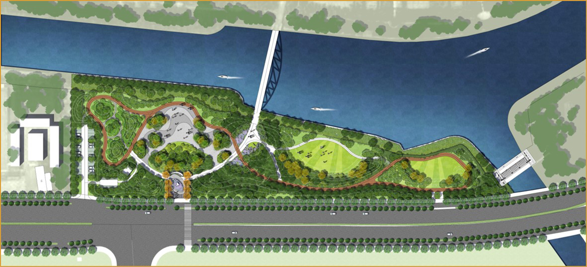 本公园位于城市运河的转弯处,公园西侧运河对岸主要以居民区为主,南侧以商业为主。公园主要以满足居民休闲、