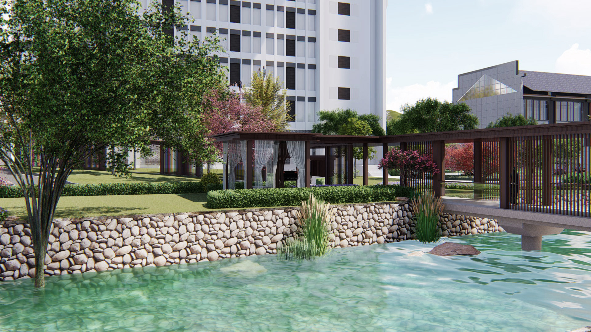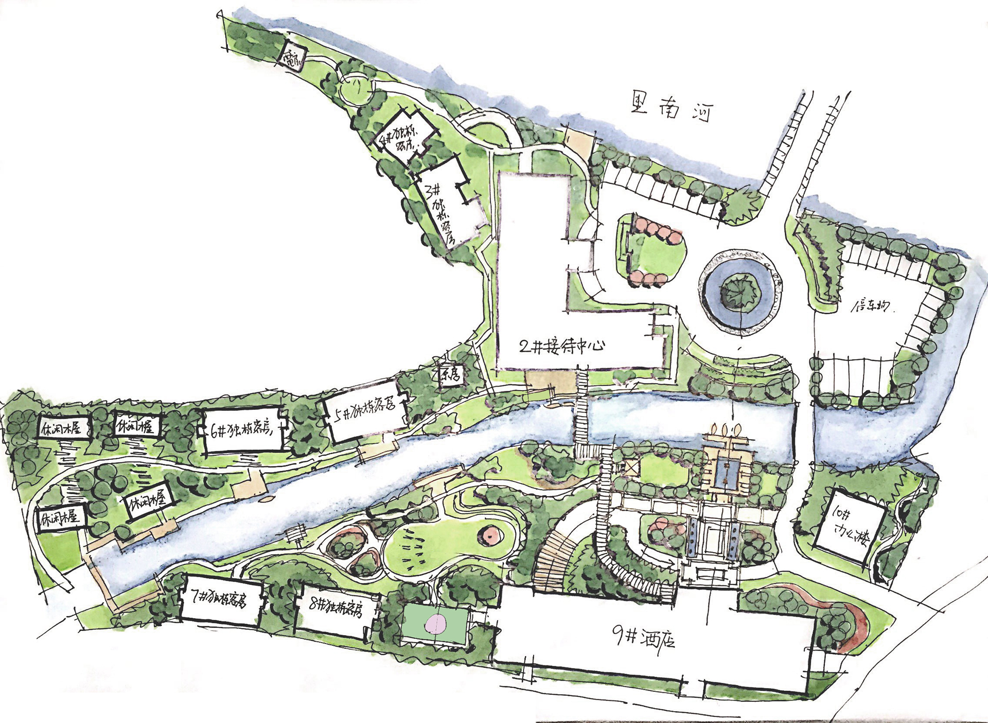 总规划用地面积18375平方米。位置上,酒店被里南河分为东西两个部分;功能上,酒店南半部分
