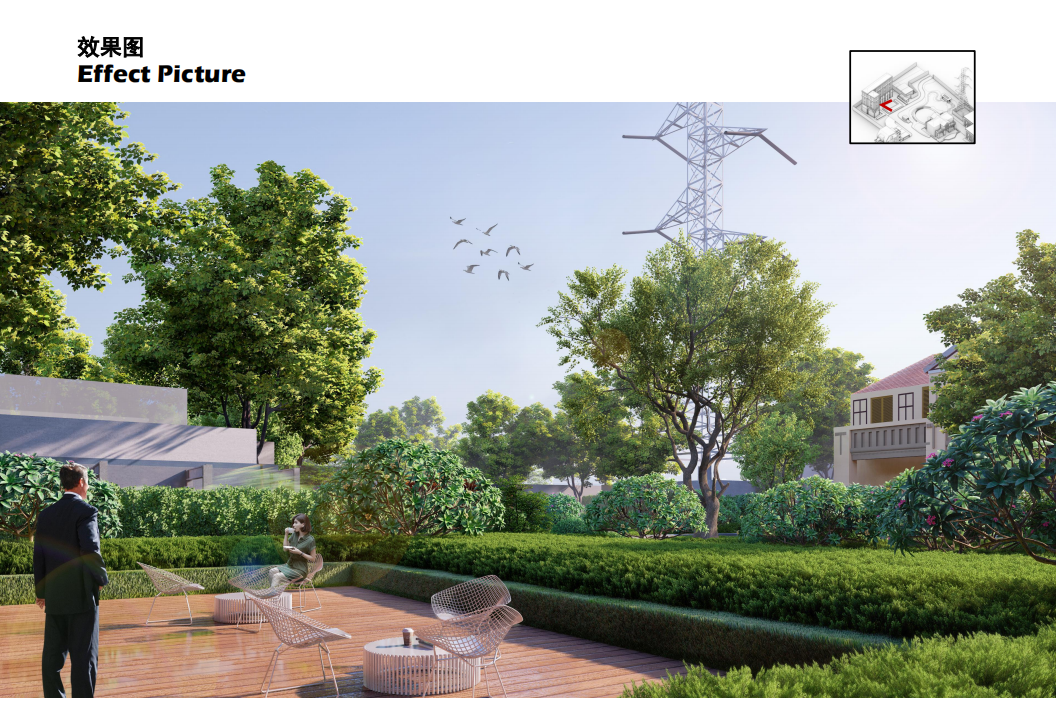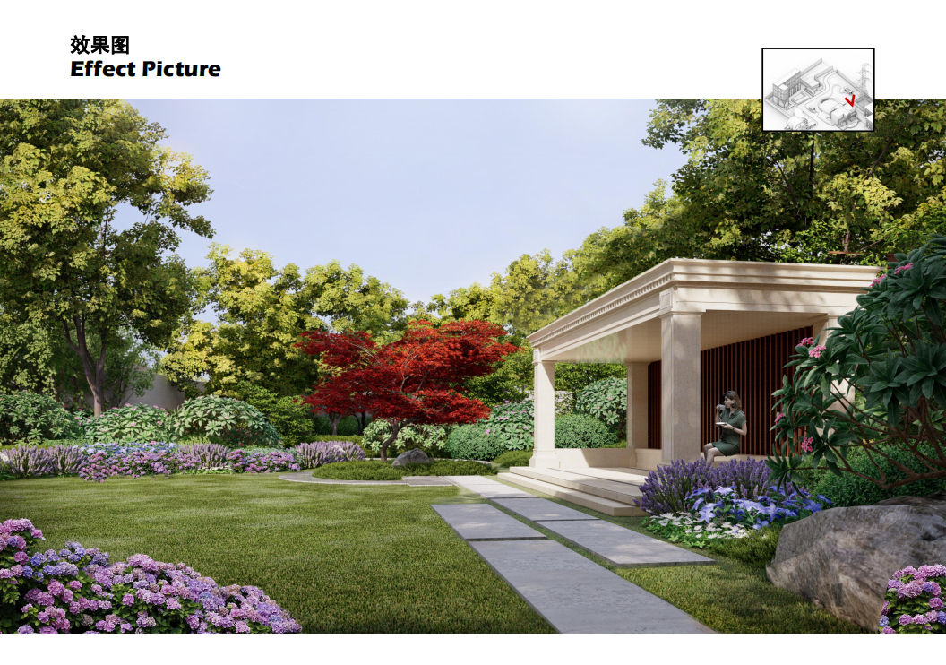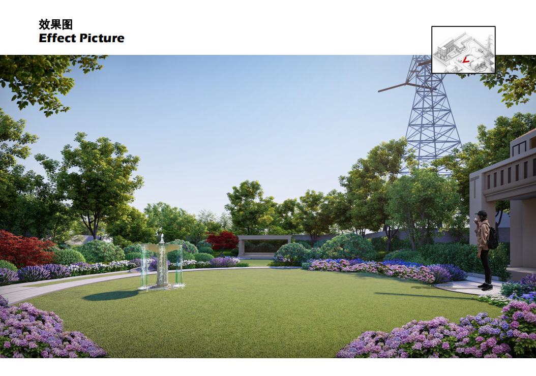 打造以布朗园林景观基调,并利用中式造园手法和元素进行景观空间设计。